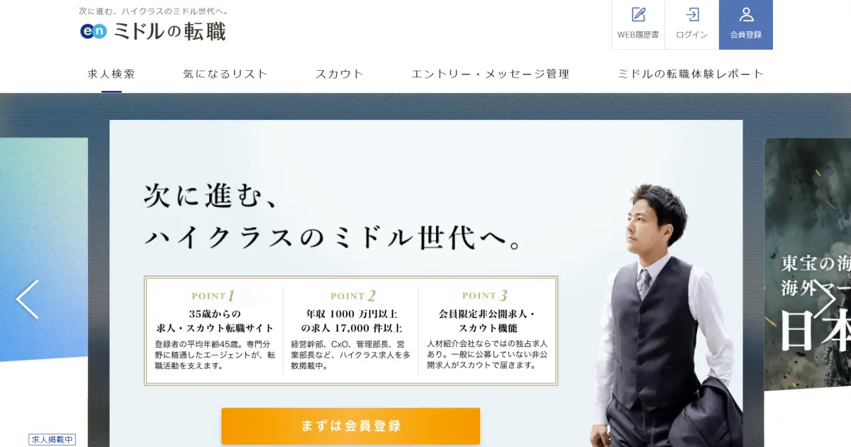 『ミドルの転職』は、年収600万円以上のミドル層・ハイクラス層を対象とした転職エージェントです。